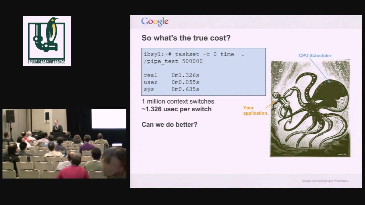 This talk is old, but I'm not sure the issue was ever solved. The idea is that modern networked services often have dependencies between tasks. Lets say task A depends on task B. In a threaded environment, this would mean A is blocked on futex or equivalent until task B eventually wakes it up. With futex, however, the kernel has no way of knowing about the task dependency relationship between A and B, so it may choose to schedule task B on a different processor than task A, especially when the processor is under load. Now, when task B wakes up task A, we incur the cost of an IPI. Multiply this by millions of tasks, and we have a performance issue.