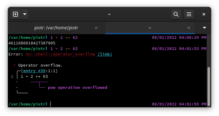 Wonderful error messages! Although it seems too limited for complex calculations... I think I'll play with Nushell in a container for a few weeks before I really install it on my system. But yes, Nushell looks like the thing I was asking for in this thread. I'll mark your post as the solution and thank you!